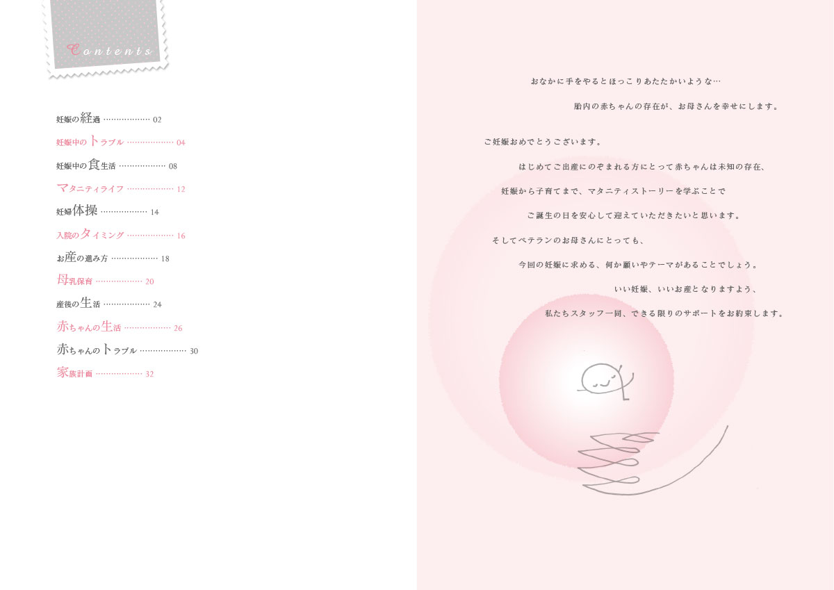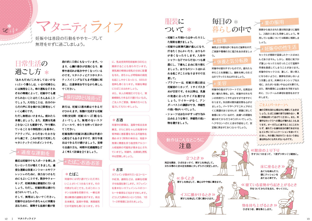 弊社では、産婦人科病医院の配布資料の編集や制作をお手伝いしてきたノウハウを活かし、どちらの施設でもお使いになれる、見て楽しく読みやすい、お求めやすい価格の“母親学級用テキスト”として商品化いたしました。